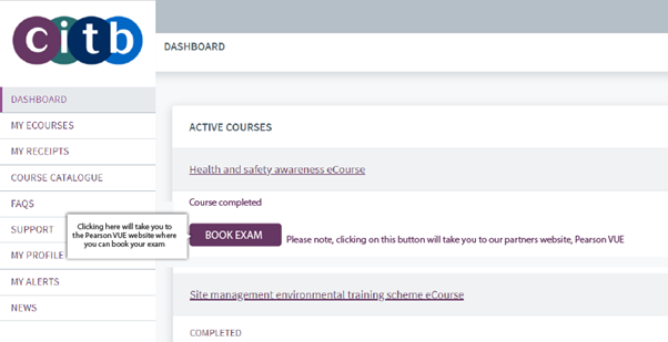 Completing your online HSA course will be shown on your dashboard, and you will then be able to book your examination, using the link shown.